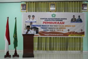 Koran Sorong, SORONG –Dalam suasana khidmat dan penuh haru, Bupati Sorong Johny Kamuru secara resmi membuka kegiatan “Bimbingan Manasik Haji bagi Calon Jamaah Haji Kabupaten Sorong Tahun 1446 H/2025 M” yang diselenggarakan di Aula Kantor Kementerian Agama Kabupaten Sorong, Jalan Wortel, Lorong Nuri, Unit 2 Aimas.