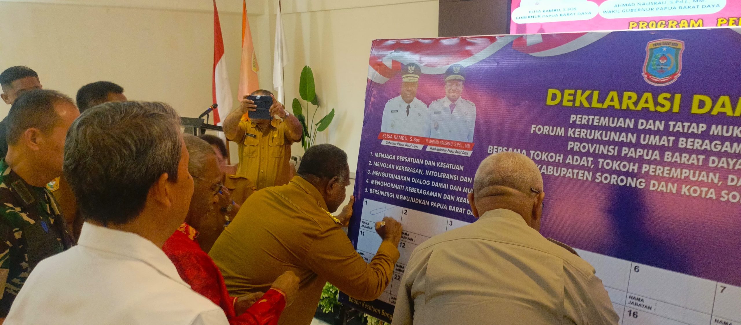 Koranonline, SORONG– Forum Kerukunan Umat Beragama (FKUB) Provinsi Papua Barat Daya bersama tokoh adat, tokoh agama, perempuan, dan pemuda Kabupaten Sorong serta Kota Sorong, menggelar deklarasi damai dan dialog kebangsaan, Selasa (09/09/25). Acara yang berlangsung di Aimas Hotel itu difasilitasi oleh Pemerintah Provinsi Papua Barat Daya melalui Badan Kesatuan Bangsa dan Politik (Kesbangpol).
