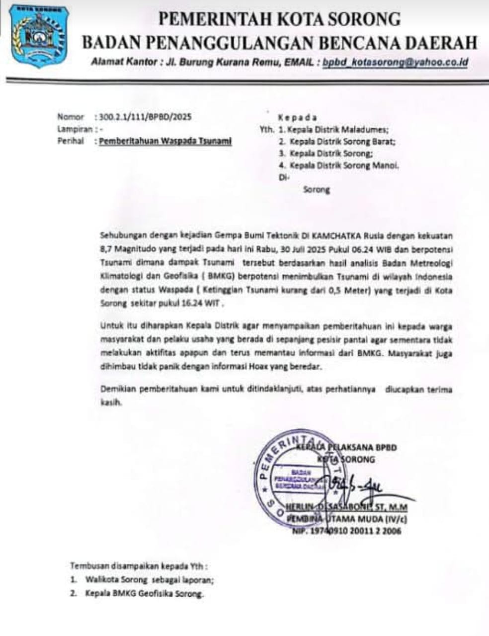 Dalam surat bernomor 300.2.1/111/BPBD/2025 yang ditujukan kepada empat Kepala Distrik di Kota Sorong yakni Maladumes, Sorong Barat, Sorong, dan Sorong Manoi BPBD menyampaikan bahwa hasil analisis Badan Meteorologi, Klimatologi, dan Geofisika (BMKG) menunjukkan adanya potensi tsunami dengan status Waspada, atau ketinggian gelombang tsunami kurang dari 0,5 meter.