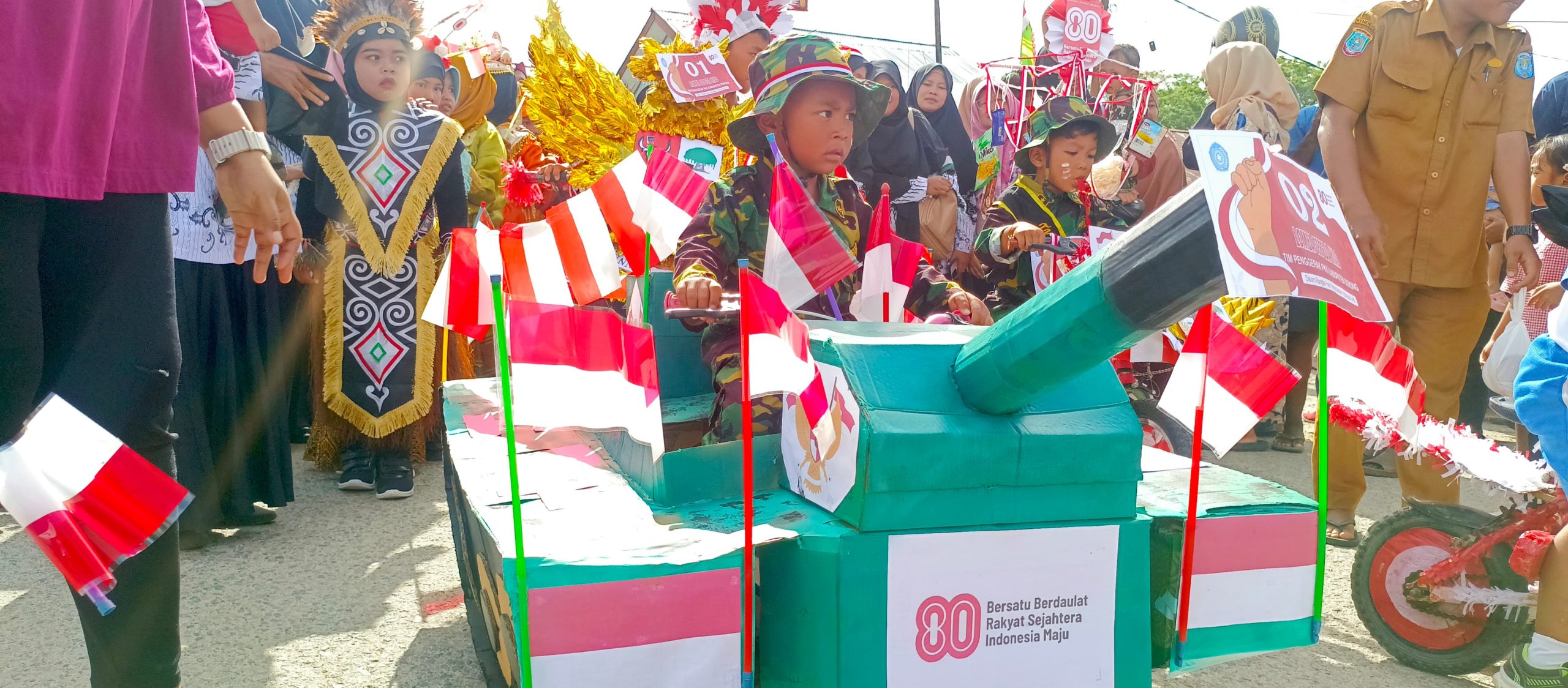 Pemandangan karnaval menjadi etalase miniatur Indonesia. Ada anak-anak bermahkota tifa dari Papua, berbalut kain songket Sumatera, hingga mengenakan kebaya Jawa dan sasando Nusa Tenggara. Sorak penonton di pinggir jalan menambah riuh suasana.