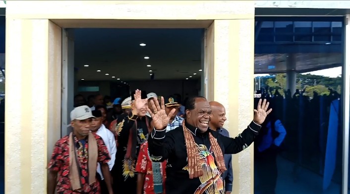 Dengan menggunakan maskapai Pelita Air 920 pukul 06.50 WIT Bupati Sorong Dr. Johny Kamuru didampingi istri dan rombongan tiba di bandara DEO Sorong dan langsung disambut dengan prosesi adat serta pengalungan bunga sebagai tanda penghormatan dan kembalinya salah satu putra terbaik Moi.