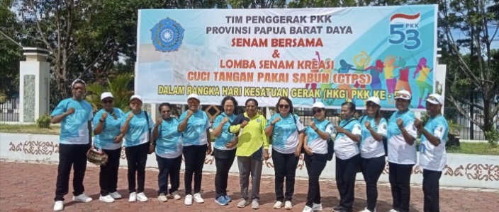 Koran Online, SORONG – Dalam rangka memperingati Hari Kesatuan Gerak (HKG) PKK ke-53, Tim Penggerak PKK Kabupaten Sorong turut ambil bagian dalam kegiatan Senam Bersama dan Lomba Senam Kreasi Cuci Tangan Pakai Sabun (CTPS) yang diselenggarakan oleh TP-PKK Provinsi Papua Barat Daya. Kegiatan ini digelar meriah di halaman Kantor Gubernur Papua Barat Daya dan diikuti oleh perwakilan PKK dari seluruh kabupaten/kota se-provinsi tersebut, Selasa (06/05/25).